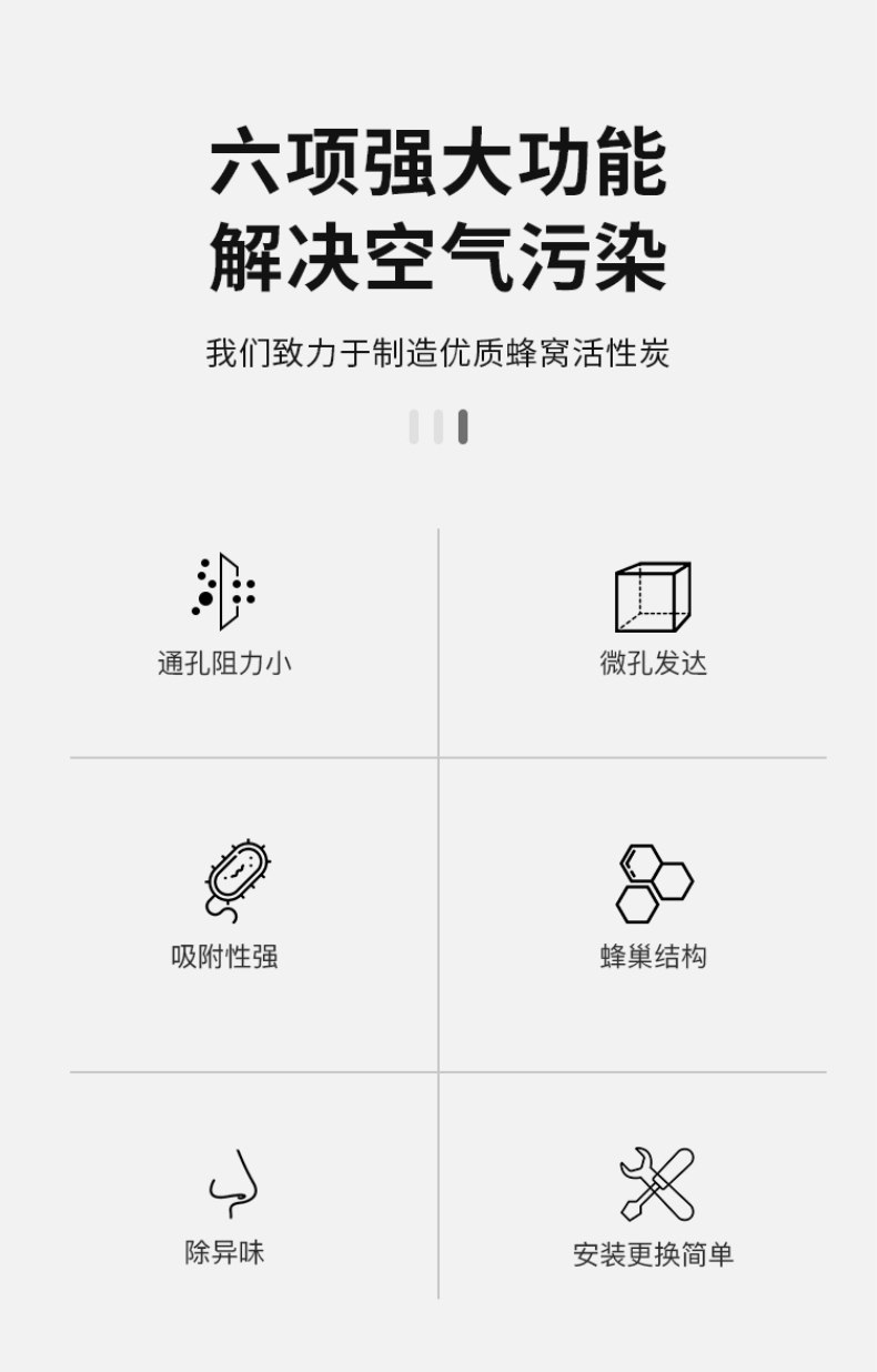 二、防油霧。蜂窩活性炭是微孔發達物質,微孔對于甲醛、苯、二甲苯等小分子粒徑的有很好,而對于油霧等大分子類物質,蜂窩活性炭的吸附能力就會減弱,油脂甚至會堵塞蜂窩活性炭微孔。