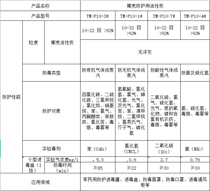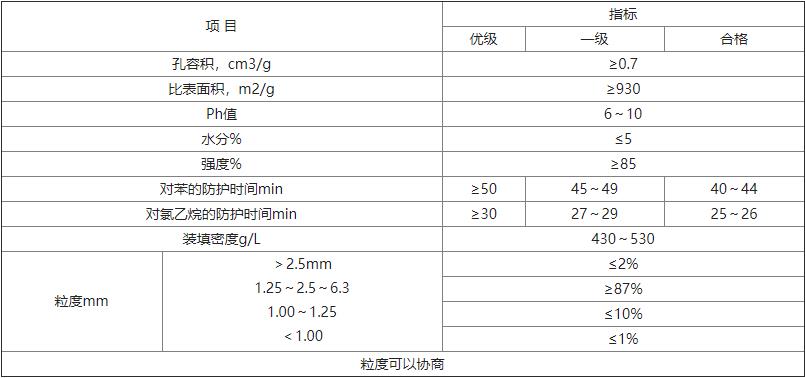 椰殼防護活性炭技術指標應符合下表要求: