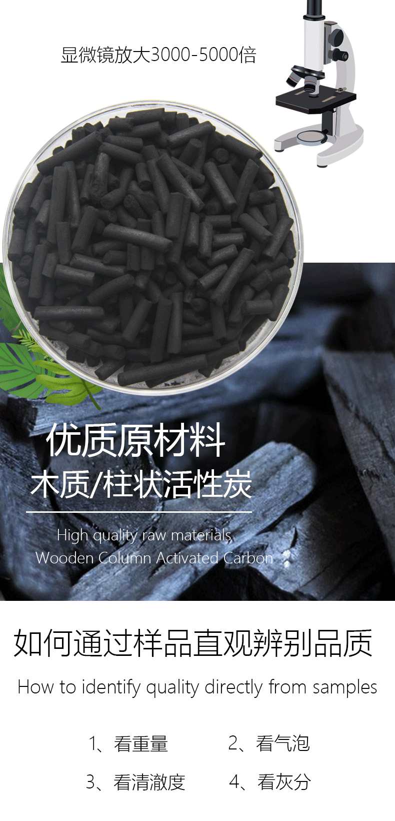 2、看密度。吸附功能好的活性炭,孔隙多,相對密度輕。在同等重量的情況下,性能好的活性炭比劣質活性炭提及大許多。