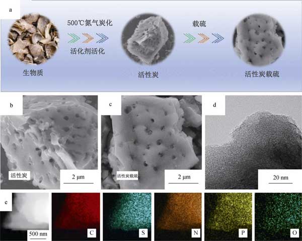 首先,除去生物質(zhì)的污垢和表面雜質(zhì),用清水徹底清洗活性炭原材料,然后用蒸餾水反復(fù)清洗,然后將它們粉碎成碎片,然后在烤箱中100°C下干燥。為了進行預(yù)碳化,將干燥的生物質(zhì)在氮氣氛下的真空管式爐中在500°C的溫度下熱解2小時,以去除少量有機分子。隨后,為了通過化學(xué)活化提高比表面積,將預(yù)碳酸化的生物質(zhì)以1:4的重量比浸入作為化學(xué)活化劑的水溶液中,然后充分?jǐn)嚢?小時以確保完全滲透。之后,將混合物在N 2下于900°C退火1小時。最后,用鹽酸反復(fù)洗滌退火后的樣品,然后用過量的蒸餾水沖洗以獲得中性pH。最終樣品通過在80°C的空氣中干燥獲得,并標(biāo)記為多孔活性炭。相比之下,使用相同步驟制備的未添加活化劑的產(chǎn)品被標(biāo)記為無孔活性炭。接著使用這兩種活性炭升級成加硫復(fù)合材料,將升華后的硫(純度>99.95%)和相應(yīng)的活性炭粉末(重量比為60:40)充分混合并在研缽中研磨。然后,將獲得的混合物用特氟隆容器密封在高壓釜中。在155°C下熱處理12小時后,獲得了多孔摻硫活性炭和無孔摻硫活性炭復(fù)合材料。