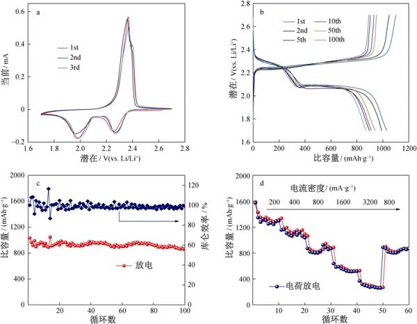 為了評估活性炭作為陰極的電化學(xué)性能,將鋰箔作為陽極組裝到鋰硫電池的紐扣電池中。用于第一,第二和第三個循環(huán)的循環(huán)伏安圖(CV)曲線上在0.05毫伏·秒的掃描速率的電位窗口進行(圖2A)。在第一循環(huán)期間,觀察到兩個陰極峰在2.26和1.97 V,CV曲線中最初的幾個循環(huán)幾乎重疊,這表明循環(huán)穩(wěn)定性極佳,容量保持率相對較高。活性炭的恒電流充電/放電曲線和循環(huán)穩(wěn)定性的測試中,如在圖中所描述2B、C。活性炭電極的首次放電容量為1045 mAh·g -1,約為硫理論容量的62.5%。此外,活性炭電極在第100次循環(huán)時也顯示出869.8mAh·g -1的放電容量。如圖2d所示測量活性炭的倍率性能,在200–3200 mA·g -1下表現(xiàn)出1260、1050、806、513、290 mAh·g -1的可逆放電容量。此外,當(dāng)電流密度達(dá)到800 mA·g時,活性炭陰極的放電容量為802 mAh·g -1。多孔活性炭材料表現(xiàn)出中等的鋰硫電池電化學(xué)性能,顯示出高性能鋰硫電池的潛力。