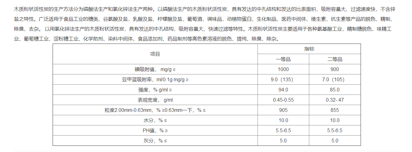 以磷酸法生產的木質粉狀活性炭,具有發達的中孔結構和發達的比表面積,吸附容量大、過濾速度快,不含鋅鹽之特性。廣泛適用于食品工業的糖類、谷氨酸及鹽,乳酸及鹽、檸檬酸及鹽,葡萄酒,調味品,動植物蛋白、生化制品、醫藥中間體、維生素、抗生素等產品的脫色、精制、除臭、去雜。